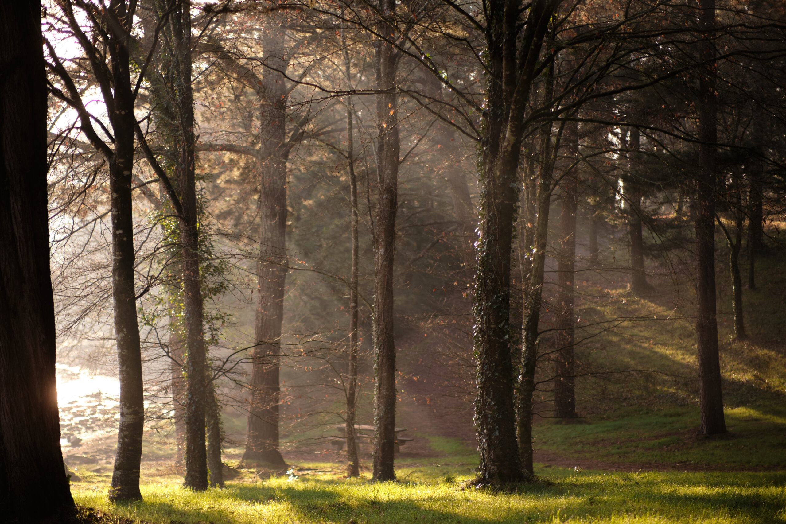 Un petit sentier entre bois et eau. Sous la lumière du matin qui sublime tout.